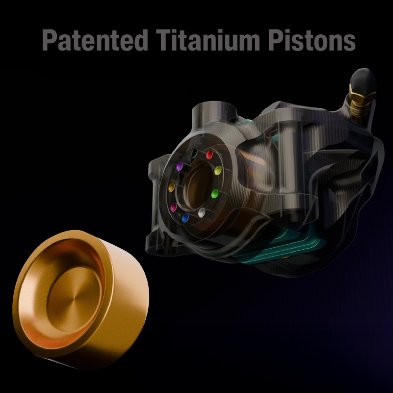 Patented titanium pistons, increase fluid capacity, effectively reduce oil temperature, and reduce risk in brake fading.