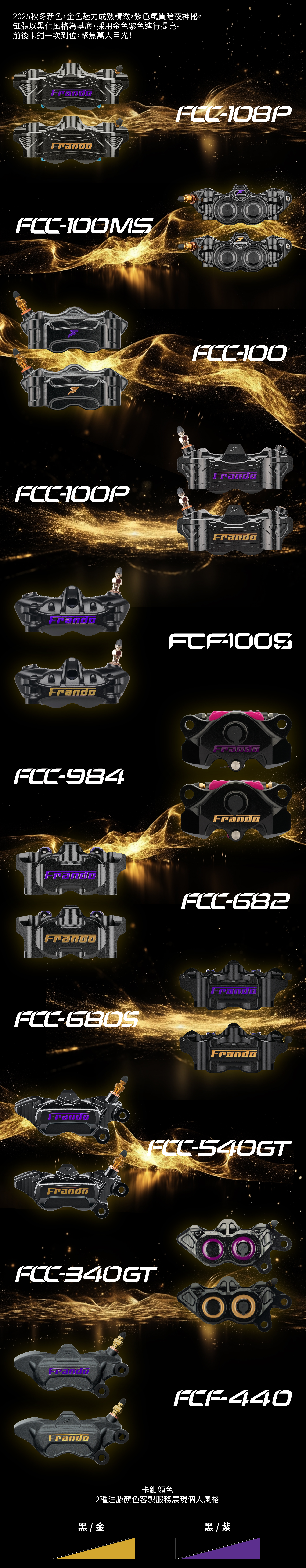 返回 All 側向卡鉗 輻射卡鉗 專用卡鉗 系列 返回 FCC-540GT CNC側向對四卡鉗 FCF-640MGT 鍛造一體式側向對四卡鉗 FCC-684M CNC一體式對二卡鉗 FCF-684M 鍛造一體式對二卡鉗 FCF-440GT 鍛造兩片式側向對四卡鉗 FCC-984 CNC兩片式側向對二卡鉗 FCC-100 CNC輻射對四卡鉗 FCC-100P CNC輻射對四卡鉗 FCC-660 CNC輻射對二卡鉗 FCC-682 CNC輻射對四卡鉗(外銷版) FCC-100MS CNC一體式輻射對四卡鉗 FCC-108MS CNC一體式輻射對四卡鉗 FCC-108P CNC輻射對四卡鉗 FCC-680S CNC輻射對四卡鉗 FCF-100S鍛造輻射對四卡鉗 FCC-760M CNC一體式輻射對二卡鉗 FCC-V4 CNC對四卡鉗 (Vespa only) FCC-V2 CNC對二卡鉗 (Vespa only) 幻紫琉金系列卡鉗 FCC-540GT CNC側向對四卡鉗 流光銀、炭晶黑 商品顏色 40mm 卡鉗鎖點 瑞士鋁合金6061 T6 卡鉗材質 30/34mm 活塞尺寸 鋁合金 活塞材質 CT3-0075 來令片型號 杜邦碳素纖維超合金 來令片材質 830g(含煞車片) 卡鉗重量 M10 1.25牙 洩氣螺絲 M10 1.25牙 油管螺絲 M10*25 1.25牙 安裝螺絲 FCF-640MGT 鍛造一體式側向對四卡鉗 絲絨銀、迷霧黑 商品顏色 40mm 卡鉗鎖點 瑞士鋁合金6061 T6 卡鉗材質 30/34mm 活塞尺寸 鋁合金表面硬化處理 活塞材質 CT1-0075 來令片型號 杜邦超合金 來令片材質 855g(含煞車片) 卡鉗重量 M6 1.0牙 洩氣螺絲 M10 1.25牙 油管螺絲 M10*25 1.25牙 安裝螺絲 FCC-684M CNC一體式對二卡鉗 硬陽銀、硬陽黑 商品顏色 84mm 卡鉗鎖點 瑞士鋁合金6061 T6 卡鉗材質 34mm 活塞尺寸 鋁合金表面硬化處理 活塞材質 CT3-0077 來令片型號 杜邦碳素纖維超合金 來令片材質 617g(含煞車片) 卡鉗重量 M6 1.0牙 洩氣螺絲 M10 1.25牙 油管螺絲 M8*20 安裝螺絲 FCF-684M 鍛造一體式對二卡鉗 絲絨銀、迷霧黑 商品顏色 84mm 卡鉗鎖點 瑞士鋁合金6061 T6 卡鉗材質 34mm 活塞尺寸 鋁合金表面硬化處理 活塞材質 CT1-0077 來令片型號 杜邦超合金 來令片材質 647g(含煞車片) 卡鉗重量 M6 1.0牙 洩氣螺絲 M10 1.25牙 油管螺絲 M8*20 安裝螺絲 FCF-440GT 鍛造兩片式側向對四卡鉗 黑紅、銀黑、銀藍 商品顏色 40mm 卡鉗鎖點 瑞士鋁合金6061 T6 卡鉗材質 30/34mm 活塞尺寸 鋁合金 活塞材質 CT1-0075 來令片型號 杜邦超合金 來令片材質 880g(含煞車片) 卡鉗重量 M10 1.25牙 洩氣螺絲 M10 1.25牙 油管螺絲 M10*25 1.25牙 安裝螺絲 FCC-984 CNC兩片式側向對二卡鉗 CT1-0077 來令片型號 FCC-100 CNC輻射對四卡鉗 硬陽銀、硬陽黑 商品顏色 100mm 卡鉗鎖點 瑞士鋁合金6061 T6 卡鉗材質 30mm 活塞尺寸 鋁合金表面硬化處理 活塞材質 SPS-0075 來令片型號 金屬燒結 來令片材質 858g(含來令片、洩油螺絲) 卡鉗重量 M10 x 1.25牙距, 鈦合金材質 洩油螺絲 M10 安裝螺絲 5mm 碟盤厚度建議值 FCC-100P CNC輻射對四卡鉗 硬陽銀、硬陽黑 商品顏色 100mm 卡鉗鎖點 瑞士鋁合金6061 T6 卡鉗材質 34mm 活塞尺寸 鋁合金表面硬化處理 活塞材質 CT3-0075 來令片型號 杜邦碳素纖維超合金 來令片材質 1000g(含來令片、洩油螺絲) 卡鉗重量 洩氣螺絲 M10 x 1.25牙距 洩油螺絲 M10 安裝螺絲 5mm 碟盤厚度建議值 FCC-660 CNC輻射對二卡鉗 硬陽銀、硬陽黑、硬陽棕、硬陽紅 商品顏色 60mm 卡鉗鎖點 瑞士鋁合金6061 T6 卡鉗材質 34mm 活塞尺寸 鋁合金表面硬化處理 活塞材質 SPS-0077 來令片型號 金屬燒結 來令片材質 580g(含煞車片) 卡鉗重量 M10 1.25牙 洩氣螺絲 M10 1.25牙 油管螺絲 M8*45 安裝螺絲 FCC-682 CNC輻射對四卡鉗(外銷版) 硬陽銀、硬陽黑 商品顏色 82mm 卡鉗鎖點 瑞士鋁合金6061 T6 卡鉗材質 27mm 活塞尺寸 鋁合金表面硬化處理 活塞材質 CT2-0080 來令片型號 杜邦陶瓷超合金 來令片材質 745g(含煞車片) 卡鉗重量 M6 1.0牙 洩氣螺絲 M10 1.25牙 油管螺絲 M10*50 安裝螺絲 FCC-100MS CNC一體式輻射對四卡鉗 硬陽銀、硬陽黑 商品顏色 100mm 卡鉗鎖點 瑞士鋁合金6061 T6 卡鉗材質 32mm 活塞尺寸 鋁合金表面硬化處理 活塞材質 SPS-0075 來令片型號 金屬燒結 來令片材質 1017g(含來令片,洩油螺絲) 卡鉗重量 M10 x 1.25牙距, 鈦合金材質 洩油螺絲 M10 安裝螺絲 5mm 碟盤厚度建議值 FCC-108MS CNC一體式輻射對四卡鉗 硬陽銀、硬陽黑 商品顏色 108mm 卡鉗鎖點 瑞士鋁合金6061 T6 卡鉗材質 32mm 活塞尺寸 鋁合金 活塞材質 SPS-0075 來令片型號 金屬燒結 來令片材質 1017g(含煞車片) 卡鉗重量 M10 1.25牙 洩氣螺絲 M10 1.25牙 油管螺絲 M10*45 安裝螺絲 FCC-108P CNC輻射對四卡鉗 硬陽銀、硬陽黑 商品顏色 108mm 卡鉗鎖點 瑞士鋁合金6061 T6 卡鉗材質 34mm 活塞尺寸 鋁合金表面硬化處理 活塞材質 CT3-0095 來令片型號 杜邦碳素纖維超合金 來令片材質 1000g(含煞車片) 卡鉗重量 M6 1.0牙 洩氣螺絲 M10 1.25牙 油管螺絲 M10*45 安裝螺絲 FCC-680S CNC輻射對四卡鉗 硬陽銀、硬陽黑 商品顏色 80mm 卡鉗鎖點 瑞士鋁合金6061 T6 卡鉗材質 32mm 活塞尺寸 鋁合金表面硬化處理 活塞材質 CT2-0080 來令片型號 杜邦陶瓷超合金 來令片材質 864g(含煞車片) 卡鉗重量 M6 1.0牙 洩氣螺絲 M10 1.25牙 油管螺絲 M8*45 安裝螺絲 FCF-100S鍛造輻射對四卡鉗 黑紅、銀黑、銀藍 商品顏色 100mm 卡鉗鎖點 瑞士鋁合金6061 T6 卡鉗材質 32mm 活塞尺寸 鋁合金表面硬化處理 活塞材質 CT2-0095 來令片型號 杜邦陶瓷超合金 來令片材質 935g(含來令片、洩油螺絲) 卡鉗重量 M10 x 1.25牙距 洩油螺絲 M10 安裝螺絲 5mm 碟盤厚度建議值 FCC-760M CNC一體式輻射對二卡鉗 FCC-V4 CNC對四卡鉗 (Vespa only) 流光銀、炭晶黑 商品顏色 瑞士鋁合金6061 T6 卡鉗材質 30mm 活塞尺寸 鋁合金表面硬化處理 活塞材質 CT2-0075 來令